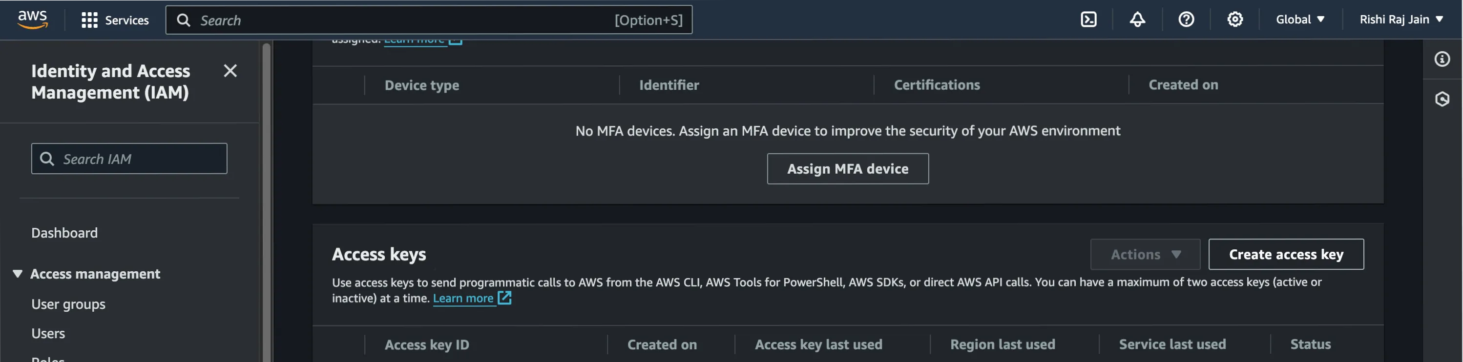 In the navigation bar on the upper right in your AWS account, click on your name, and then choose **Security credentials**.
